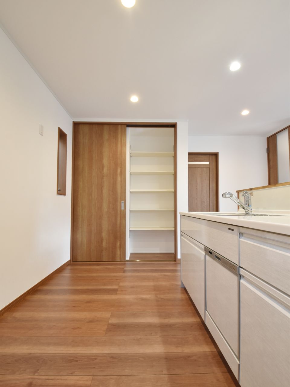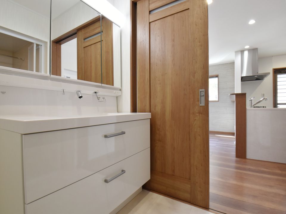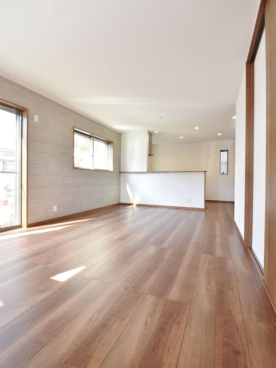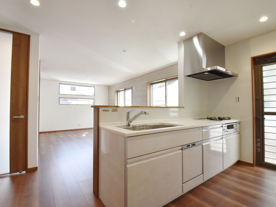 1階には約18帖のリビングダイニングと、キッチン・バスルーム・洗面室の水まわりを集約。