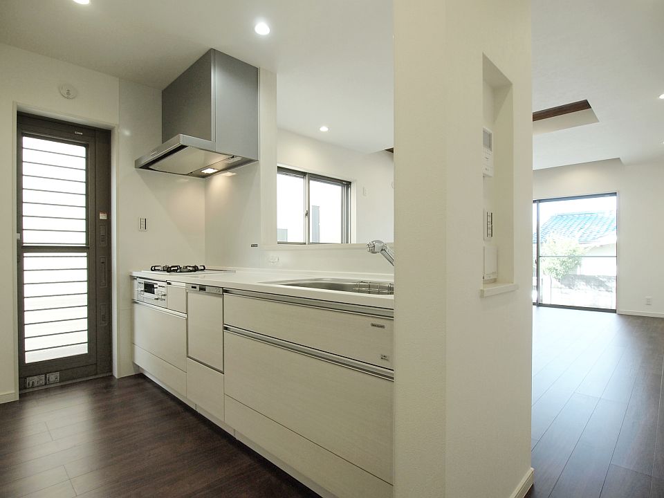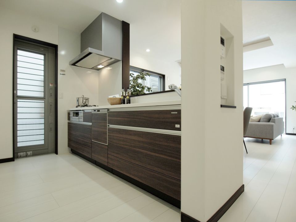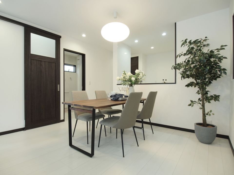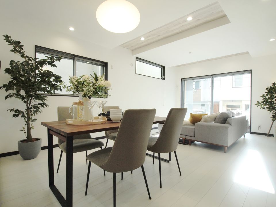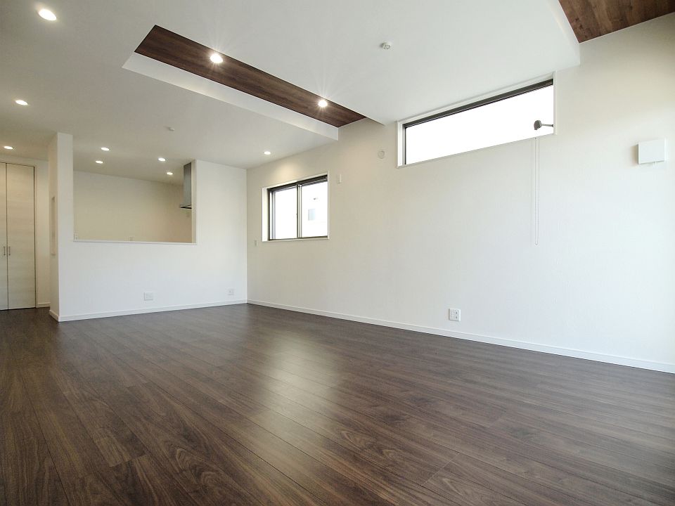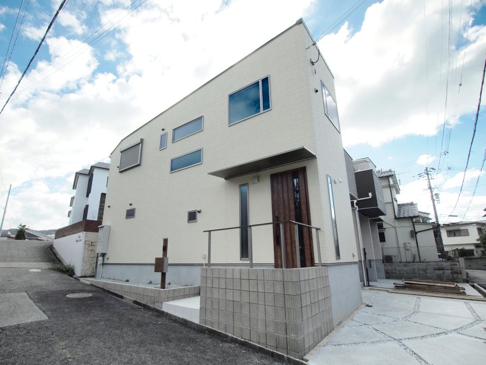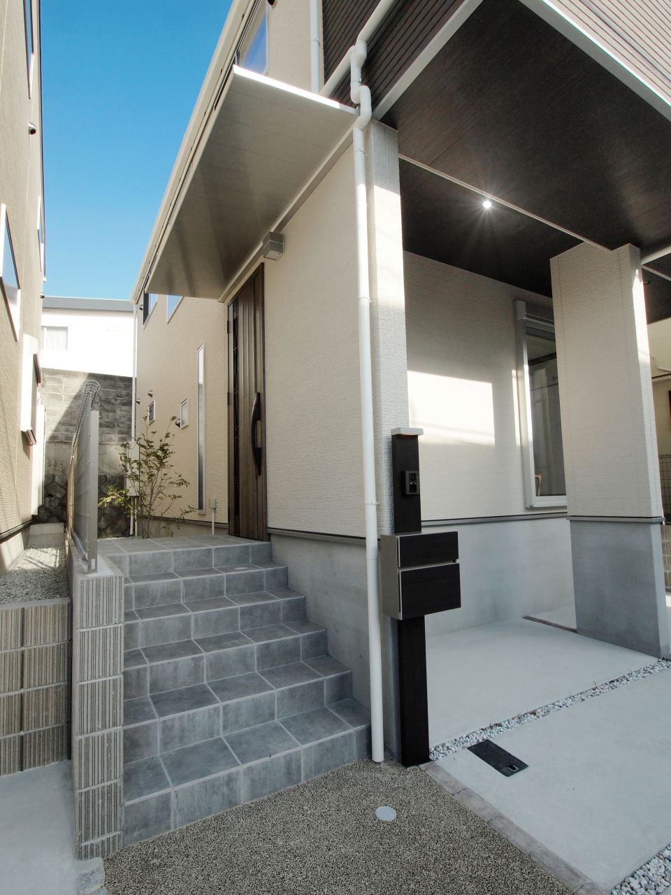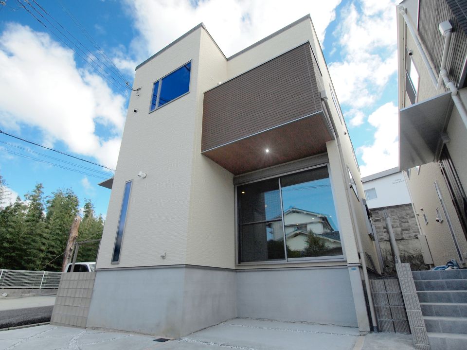 神戸市垂水区、海と山に挟まれた高台での分譲実績です。 色味で印象を変えつつ、2邸ともに木目を外観のアクセントにしています。どっしりと構えた地面から、空に伸びていくようなデザインに。 約17帖の1階リビングは、採光のとれる南向きに。折り上げ天井で、広々とした空間を引き締めています。家族のコミュニケーションを自然と増やしてくれるリビング階段も魅力。 穏やかな住宅地の雰囲気を感じながら、休日にはのんびりとまどろむ時間を楽しめる家になりました。